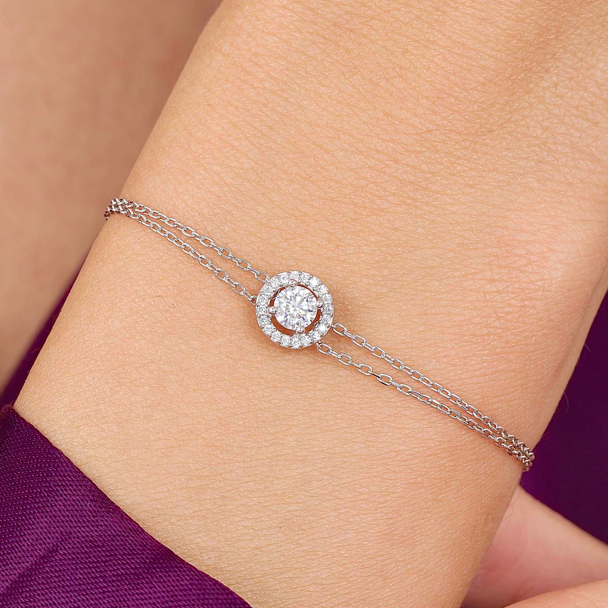 Zarafeti ve ışıltıyı bileğinizde taşıyın. Bu "Büyülü Işıltı" bileklik, merkezindeki tek bir yuvarlak kesim mozanit taşının, etrafını saran mikro mozanit taşlarından oluşan göz alıcı bir hale (Halo) ile vurgulanmasıyla klasik bir ihtişam sunar. İnce ve zarif çift zincir detayı, mücevherin modern ve akıcı duruşunu pekiştirerek bileğinizde sofistike bir dokunuş yaratır. Toplam 0.24 karat mozanit taşıyla, günlük lüksten özel davet şıklığına kadar her anınıza eşlik eder.
