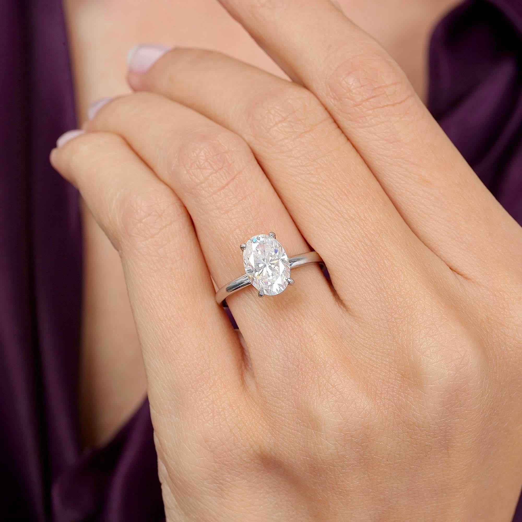 Oval kesimin modern ve zarif yapısını vurgulamak için bu yüzüğü tek başına bir yıldız parça olarak kullanabilirsiniz.