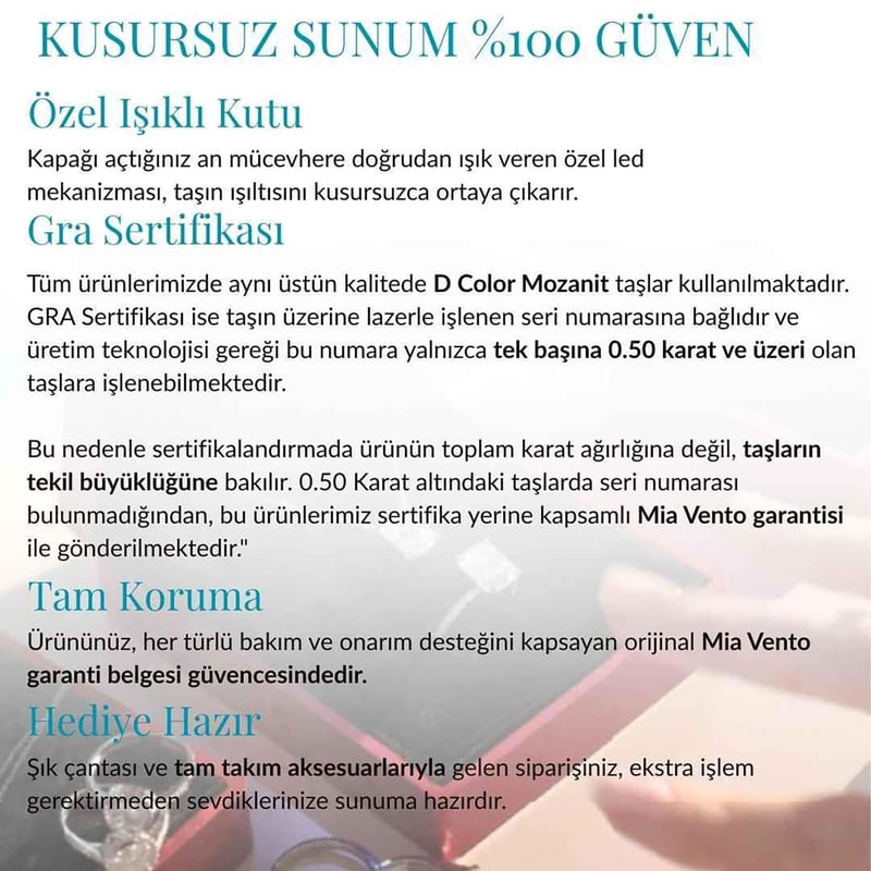 Siparişiniz sevdiklerinizi veya kendinizi her an mutlu edeceğiniz bir şekilde özel hediye paketi, kutusu*, çantası ve garanti belgesi ile gönderilmektedir. Mia Vento’dan yapacağınız tüm gümüş takı alışverişlerinizde istisnasız özel paketleme uygulanmaktadır.